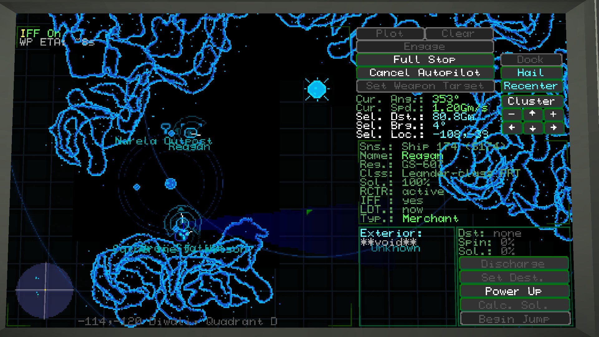Information technology looks equally retro as it sounds. You never see outside space-action in 3D, the way other games bear witness it. Here, it unfolds as minor pixelated blobs flight around a 2d map. What the outside of your ship looks like y'all tin only imagine; all you lot ever see are interiors, which y'all move through one screen at a time - either on your ship or on the infinite stations you dock at for cargo, repairs, passengers or supplies. The characters y'all do come across are starkly polygonal, pulled from an early era of 3D, and all the conversations yous have - near all of your interactions with the game, really - are handled mesomorphic via old-school text.